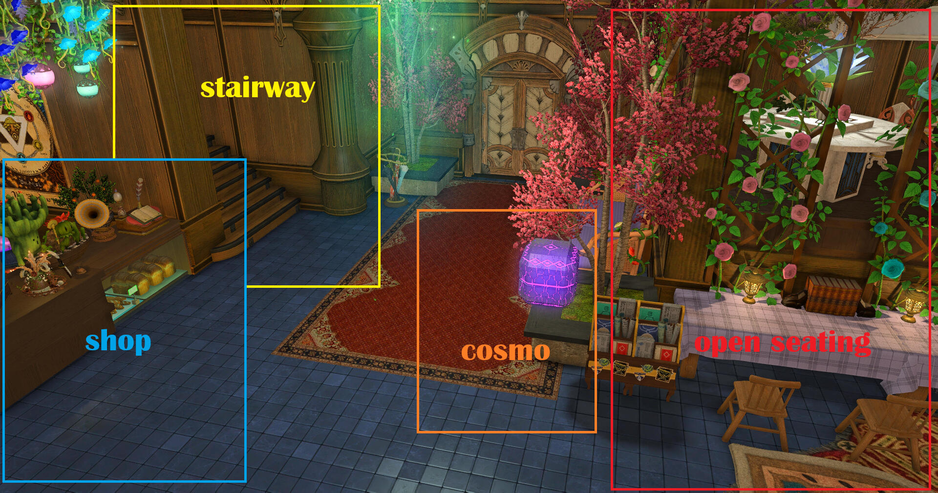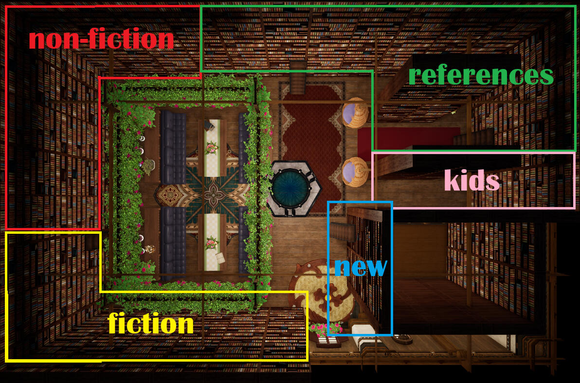 The upstairs serves at the most important part of Enchanted Pages, the library. The map indicates how the books are organized.